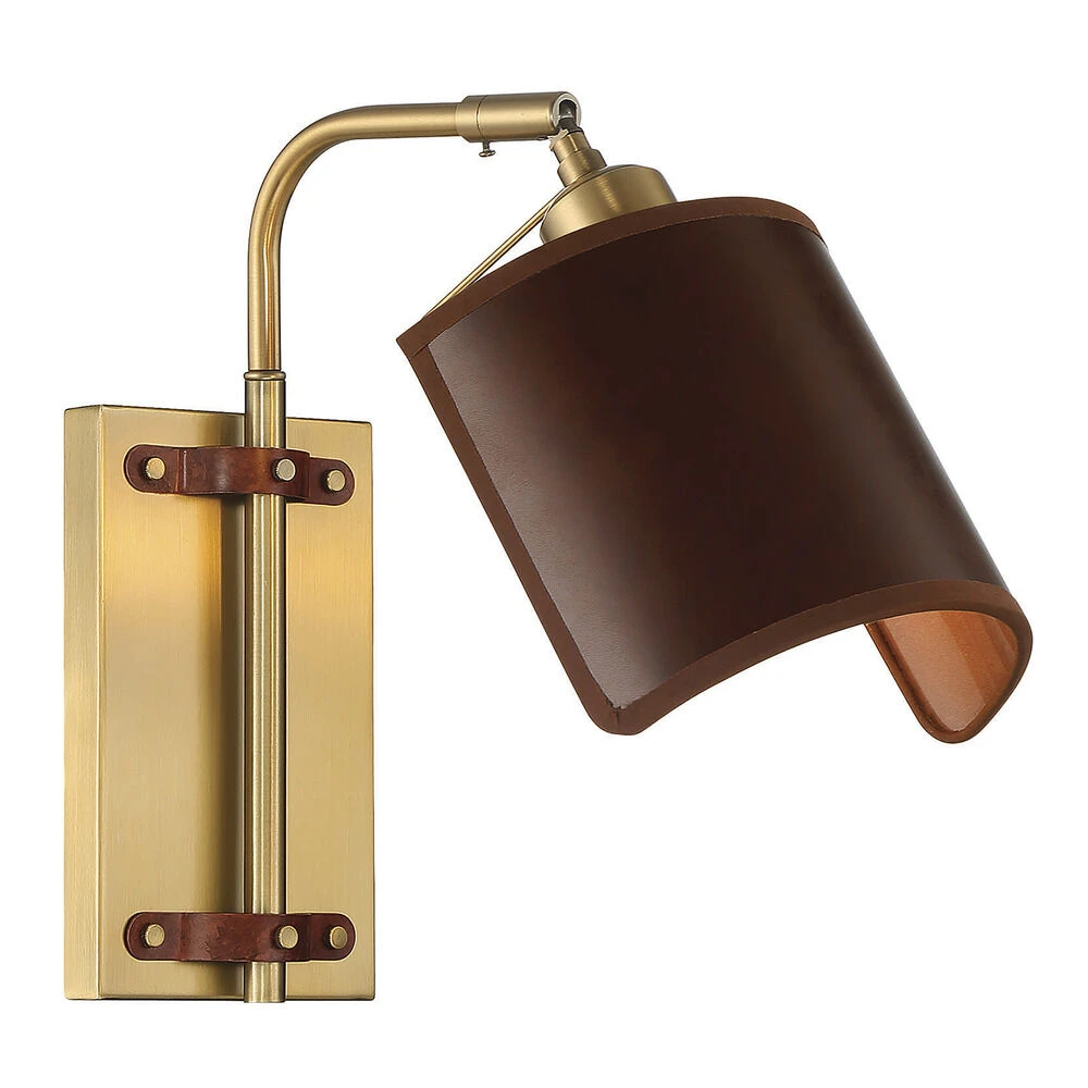 Enhance your space with this unique wall light by Meridian. This wall mount features an Industrial-style leather shade and a Natural Brass finish. This sconce extends from the wall from 7-18 inches total. Bulb not included.