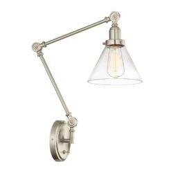 Mount Alexa Hampton’s Jane Single Library Wall Light by Visual Comfort next to your bed or your favorite reading chair for both style and light that can be aimed where you need it. The Jane features a shiny Polished Nickel finish and a conical Linen shade. It has an adjustable arm, making it easy to aim your reading or task light right where it’s needed. The Jane requires one 40W maximum medium base A19 light bulb and includes an On/Off switch.