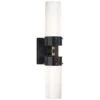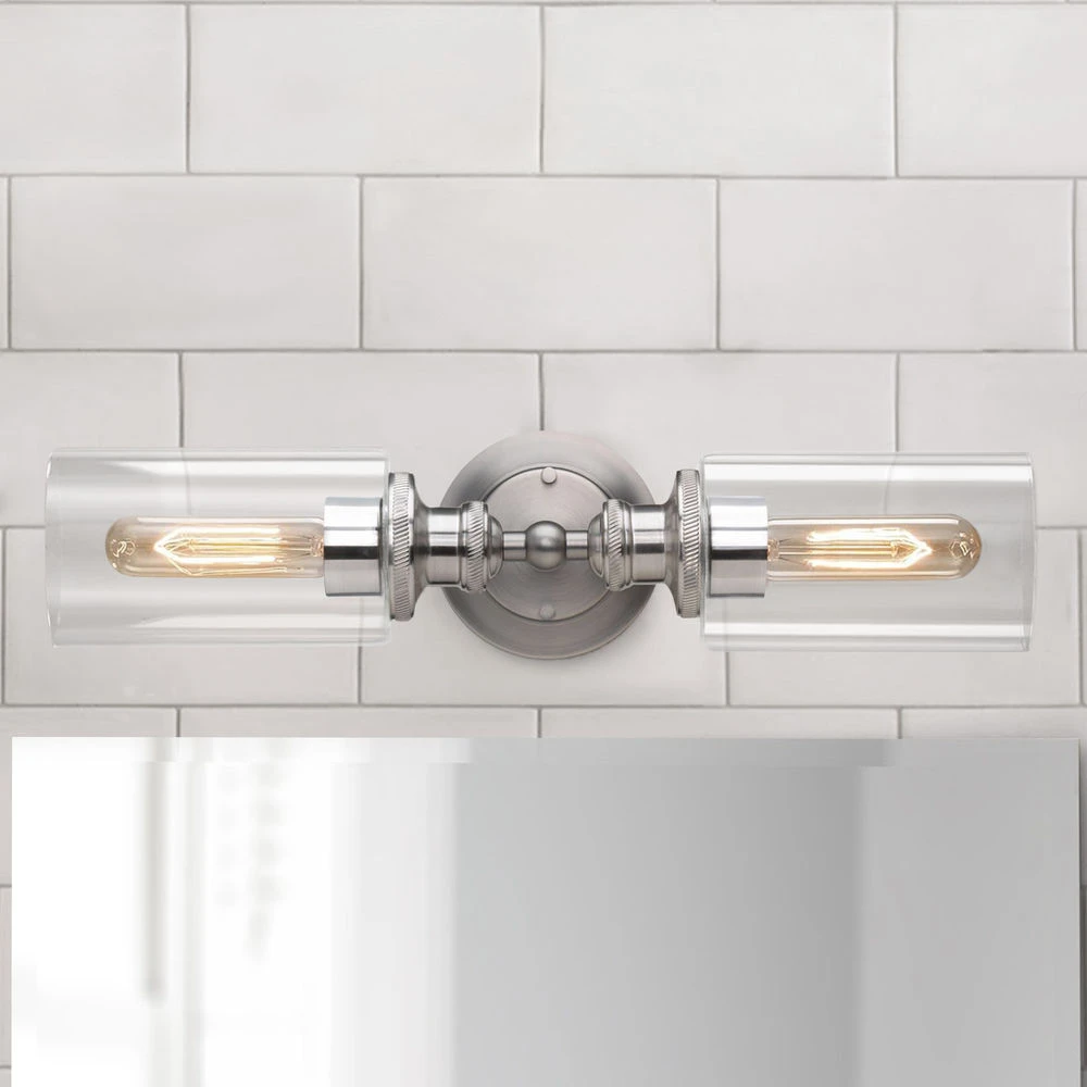 Industrial two-light bath & vanity fixture offer a vintage electric feel. Clear glass shades featured on either side of the back plate. Two-toned finish antique nickel with polished chrome accents. Can be mounted horizontally or vertically.