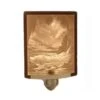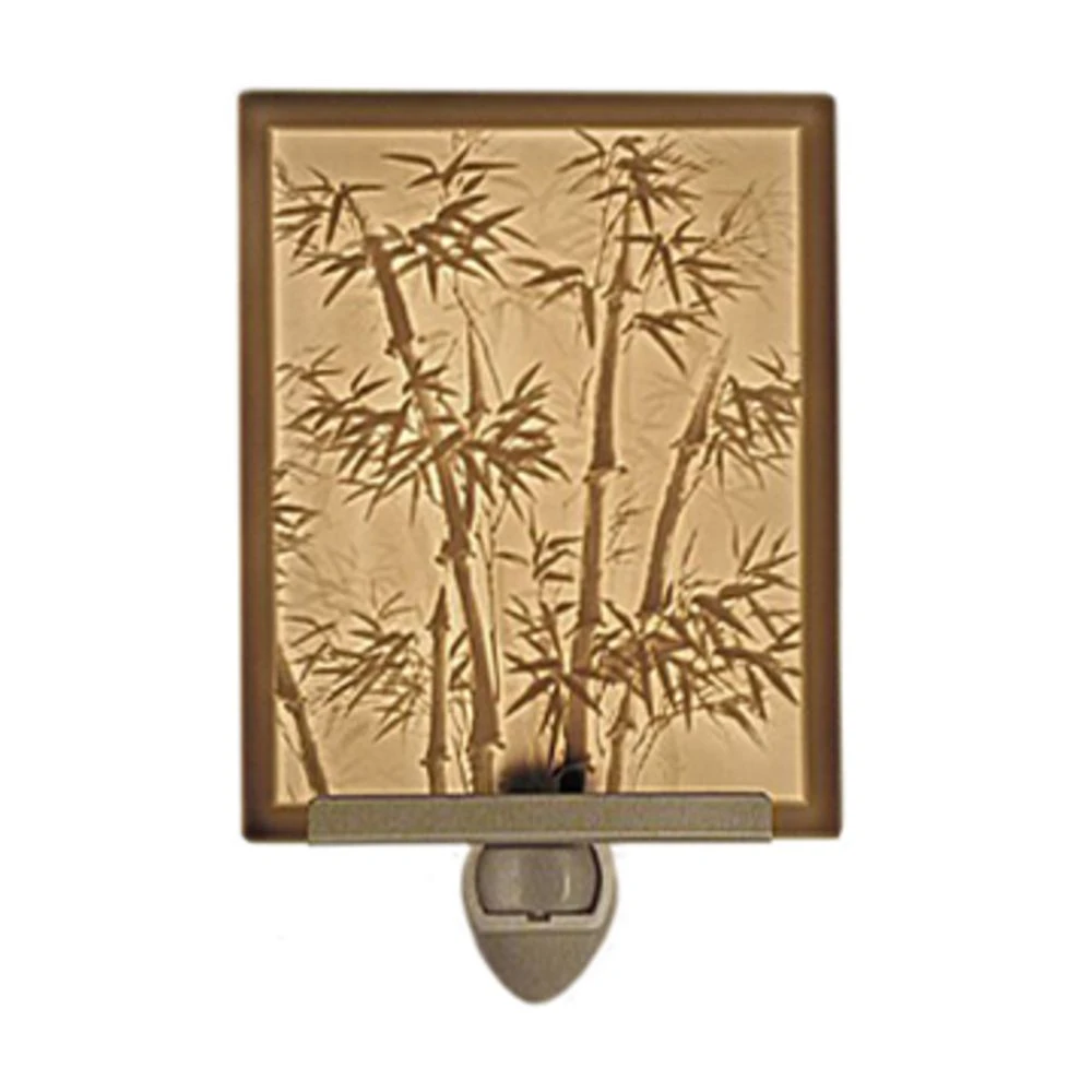 This lithopane night light glows with etched bamboo leaves. It readily plugs into any wall outlet and a convenient rocker switch turns it on and off. The detachable base allows it to be hung from the top as well. Includes a 7-watt bulb. Handcrafted in the U.S.A.