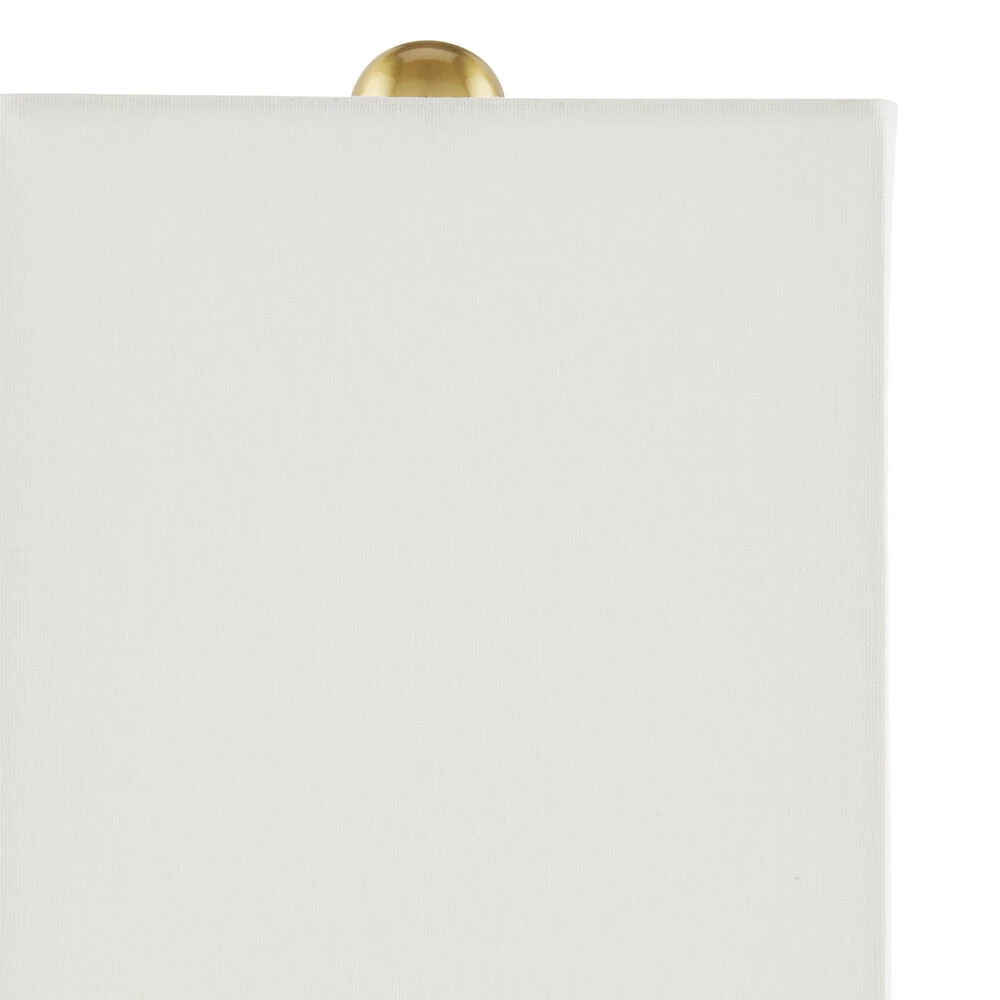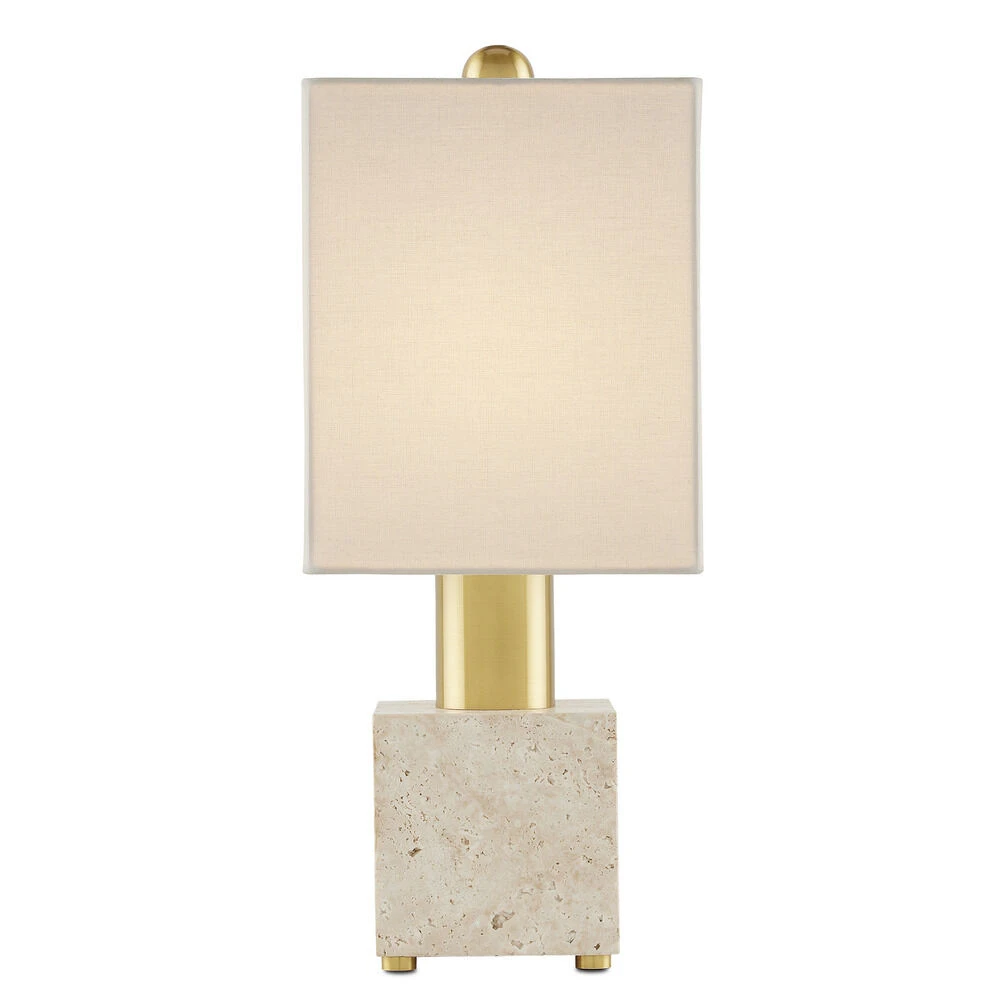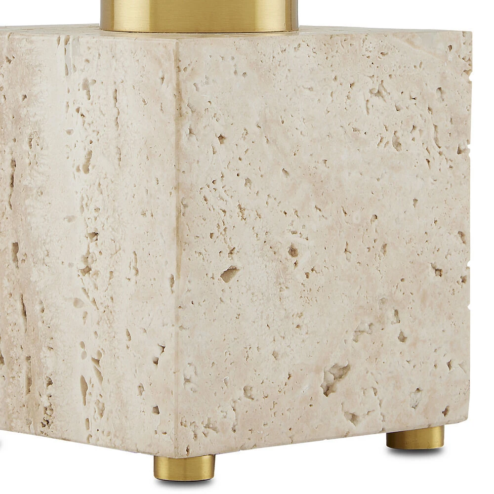 The geometric shape of Currey & Company’s Goletta Table Lamp is made from a mix of textural travertine and smooth steel in an Antique Brass finish. Inherent variations in the stone’s texture, veining and color are to be expected with each lamp. This lamp also includes a Bone linen shade.