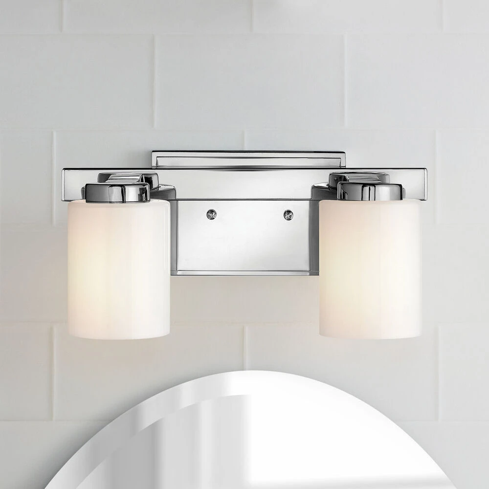 Transitional chrome 2-light bathroom light with cased opal glass shade