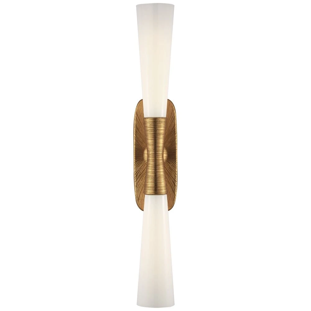 Kelly Wearstler’s Utopia 32-Inch Double Bath Sconce by Visual Comfort is the perfect wall mount for your bathroom or powder room. The Utopia has long cone-shaped White glass pieces and features a bright Gild finish. The Utopia includes two 12W medium base T10 light bulbs. This fixture is rated for Damp Location.