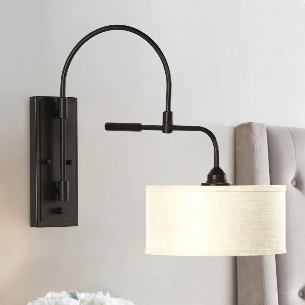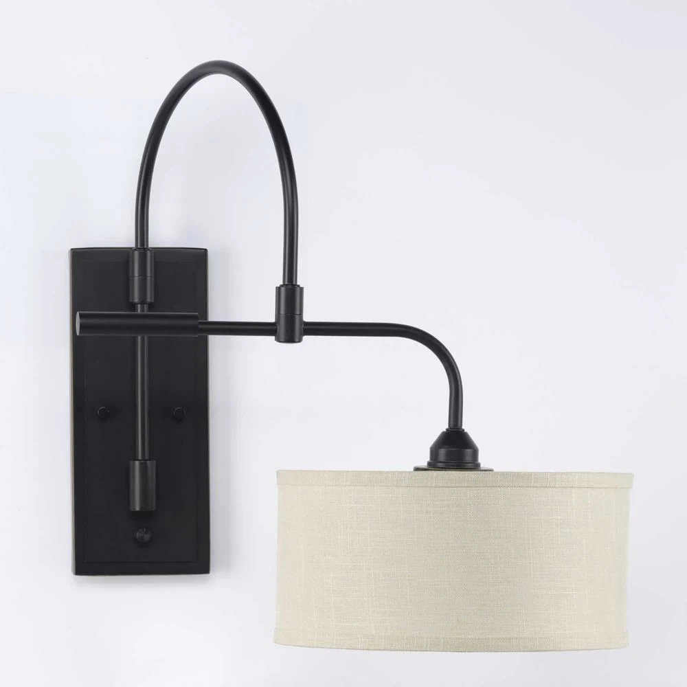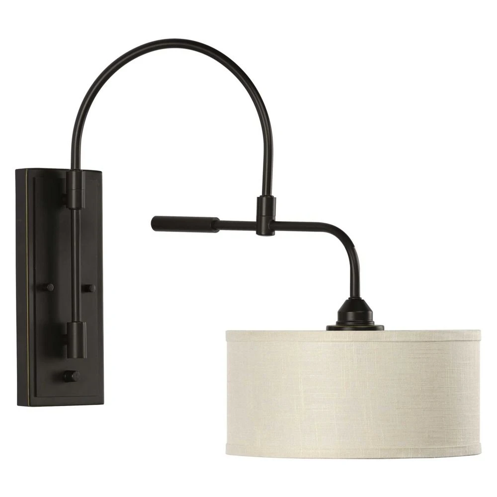 The contrast of a textured Harvest Linen shade supported by a refined, Antique Bronze wall mount makes the Kempsey one-light wall bracket ideal for providing focused task light in a bedroom, office, den, or living room. The union of the rectangular backplate and smoothed, curved arms will make an eye-pleasing piece in any transitional or farmhouse setting.