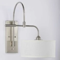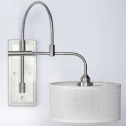 Kick back and relax within the pages of your favorite novel under the glow of the Kempsey one-light wall bracket. A smooth, arced arm extends from a rectangular backplate to hold the small, curved bar that supports a clean, Summer Linen shade. With an alluring Brushed Nickel finish, the fixture blends well with transitional and farmhouse interiors where it can provide focused task light while mounted to a wall in a bedroom, office, den, or living room.