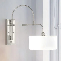 Kick back and relax within the pages of your favorite novel under the glow of the Kempsey one-light wall bracket. A smooth, arced arm extends from a rectangular backplate to hold the small, curved bar that supports a clean, Summer Linen shade. With an alluring Brushed Nickel finish, the fixture blends well with transitional and farmhouse interiors where it can provide focused task light while mounted to a wall in a bedroom, office, den, or living room.