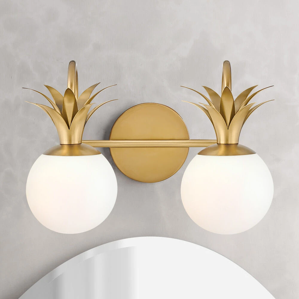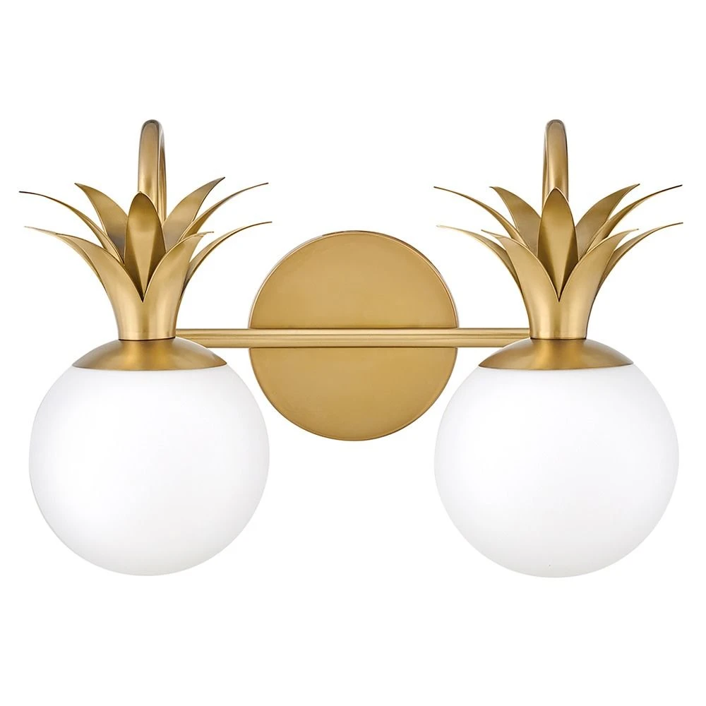 The Palma vanity light by Hinkley Lighting blends European elegance with a touch of the classic pineapple motif. This fixture is available in a gorgeous, warm Heritage Brass and features round etched opal glass shades. It is rated for use in damp applications. 4.5W LED G9 light bulbs are recommended, but not included (EG9L-4.5).