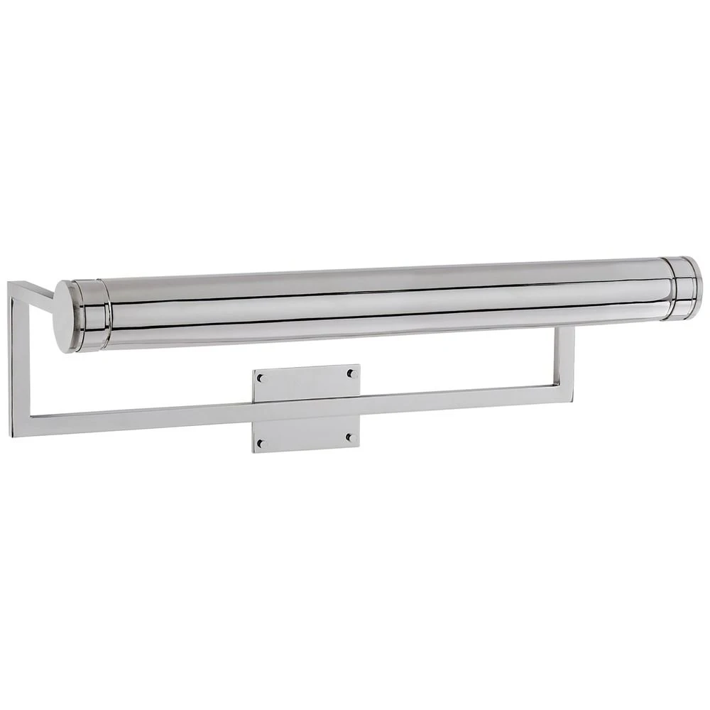 The Cosmopolitan 30-Inch Picture Light by designer Thomas O’Brien is another unique piece by Visual Comfort. This hard-wired fixture features a shiny Polished Nickel finish and an adjustable half-cylinder metal shade so light can be aimed where it’s needed. This picture light has a rectangular backplate and requires a small outlet box for mounting. It requires three 25W maximum T10 bulbs.