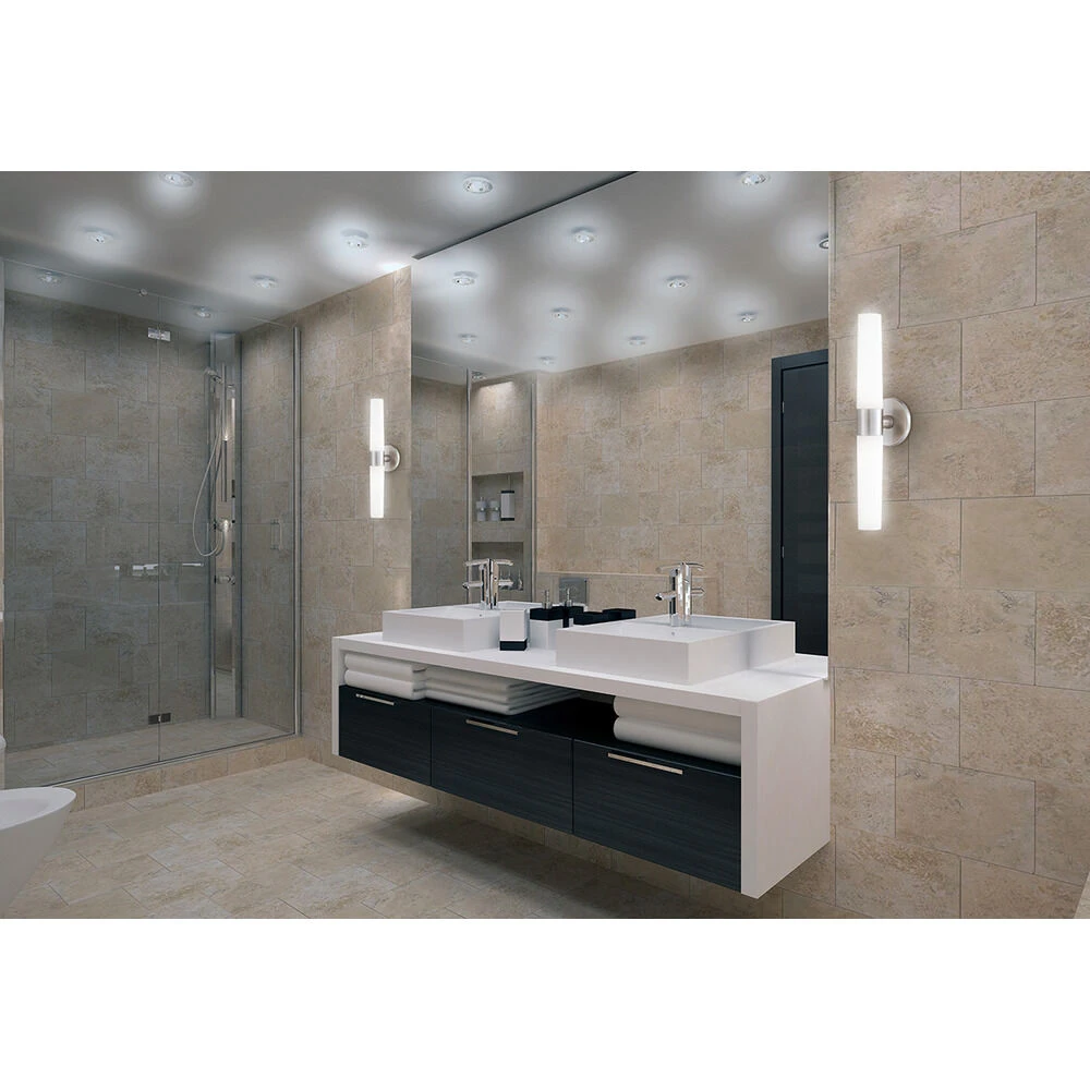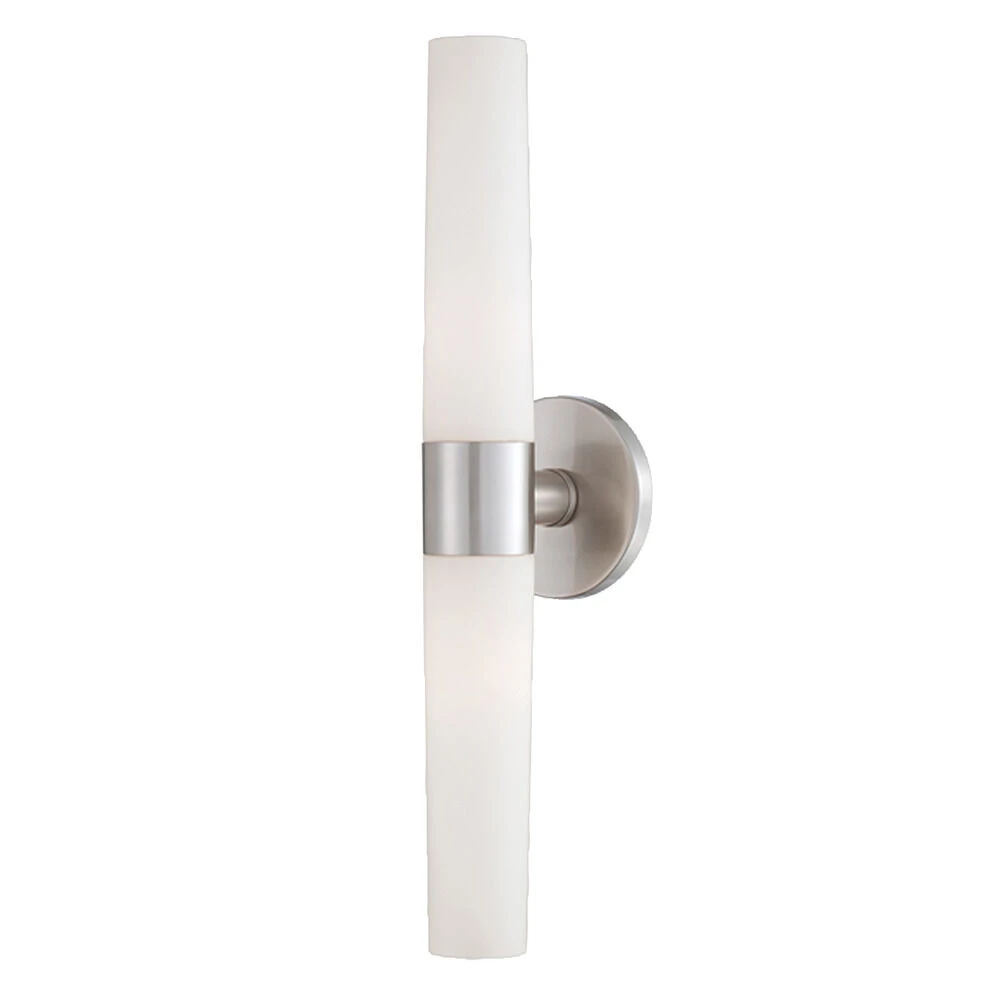 Illuminate your bathroom or powder room with the Vesper Vanity Light by Eurofase Lighting. The Vesper features a Brushed Nickel finish on its cast metal frame, and two frosted glass tubes. This fixture requires two 60W maximum medium base T10 light bulbs (sold separately). Fixture can be mounted vertically or horizontally.